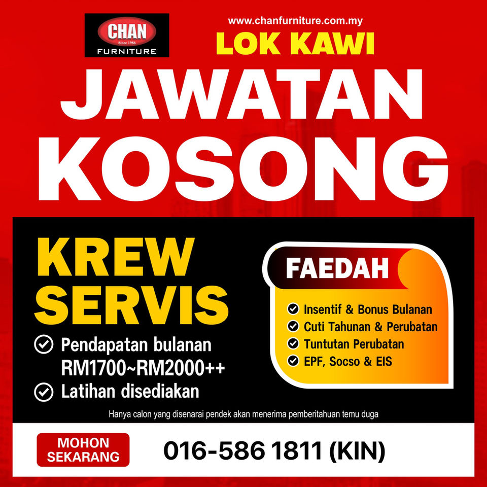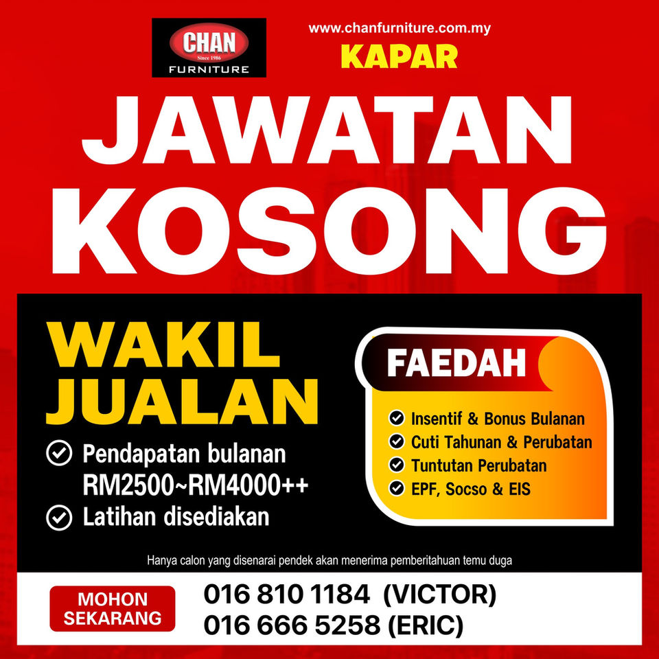 Di Chan Furniture, kami menyediakan latihan dan pembangunan berterusan untuk membantu anda menguasai produk, perkhidmatan pelanggan, dan kemahiran jualan, supaya kerjaya anda berkembang bersama kami.